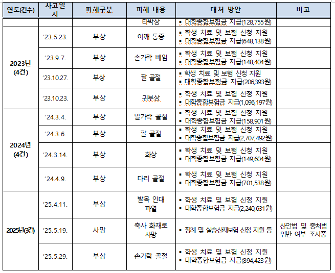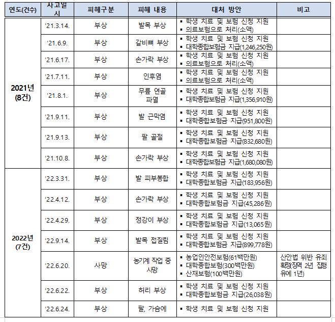 올해 발생한 돼지농장 사망사건 역시 조사 중이며, 이 외 다른 사고들에 대해서는 「중대재해처벌법」 적용 사례가 전무한 실정이다. 게다가 한농대에서 지급하는 대학종합보험금 역시 중상을 입었음에도 대부분 100만 원 이하 보상에 그쳤다.