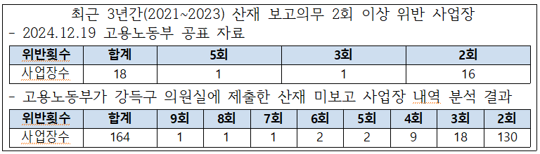 그러나 강득구 의원실이 고용노동부로부터 제출받은 산재 미보고 사업장 내역을 분석한 결과, 같은 기간 산재 보고의무를 2회 이상 위반한 사업장이 실제로는 164곳이었던 것으로 확인됐다. 제일 많이 위반한 곳은 9회나 위반했으며, 3회 18곳, 4회 9곳 등 3회 이상 위반 사업장만 해도 34곳이었다.