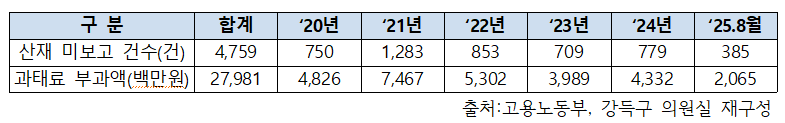 2020년 이후 올해 8월까지 산재 보고의무 위반 적발 건수는 총 4,759건, 부과된 과태료는 279억 원, 건당 평균 과태료는 587만 원이다.