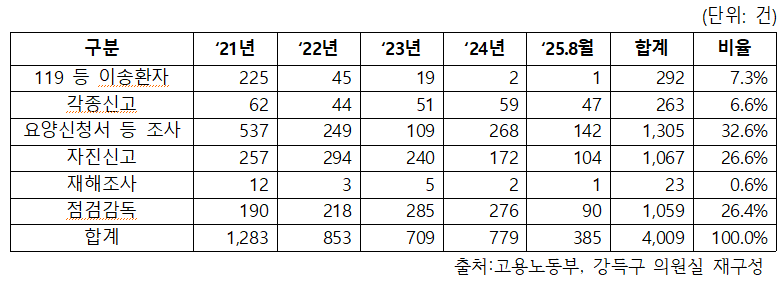 2021년부터 올해 8월까지 미보고 적발 사례 중 자진신고 비율은 26.6%나 된다. 산재 미보고나 은폐 사례는 확인된 것보다 훨씬 더 많을 가능성이 크다.