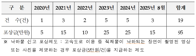 도로공사가 낙하물 신고 포상제를 운영하고 있지만, 실제 포상을 받기는 쉽지 않다. 지난해 포상금을 받은 신고자는 5명에 불과했고, 올해는 3명으로 더 줄었다.