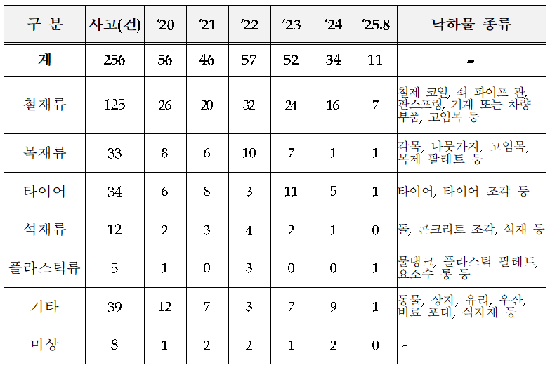 사망·부상 사고를 불러온 낙하물 종류는 절반 가까이(49%)가 철제류(125건)였다. 철제 코일·판스프링·쇠파이프 관·고임목 등 노후되었거나 과적을 위해 불법 개조한 화물차에서 주행 중 이탈한 경우가 많다.