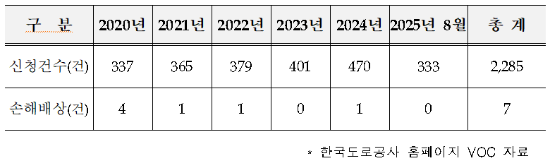 이에 대해 정 의원은 “단속과 보상 체계 모두 여전히 미흡하다.”며 “도로공사도 찾기 어려운 가해 차량 추적 책임을 피해자에만 맡길 것이 아니라 유료 고속도로를 운영하는 공공기관으로서 이용자 안전에 대한 관리 책임을 강화해야 한다.”고 지적했다.