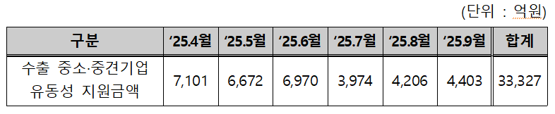 ▲중소중견 대상 유동성 지원현황(‘25.4~9월)