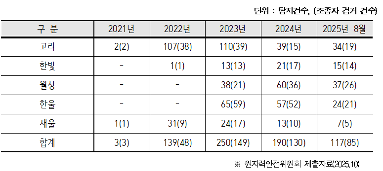 조국혁신당 이해민 의원(조국혁신당, 국회 과학기술정보방송통신위원회)이 원자력안전위원회로부터 제출받은 자료에 따르면 2021년부터 2025년 8월 기간동안 원전 인근에서 탐지된 불법드론은 총 699건으로 이중 284건(40.6.%)은 조종자 신원이 확인되지 않는 것으로 나타났다.