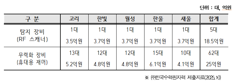 현재 국내에서 운영 중인 원전은 고리·한빛·월성·한울·새울 등 5개 본부, 총 21기에 달한다. 한수원은 불법드론을 차단하기 위해 2022년 고리원전을 시작으로 RF스캐너와 휴대용 재머 등 매년 약 8.7억원 수준의 예산을 투입하여 시스템을 구축해왔다.드론 탐지 장비 도입 현황