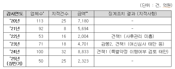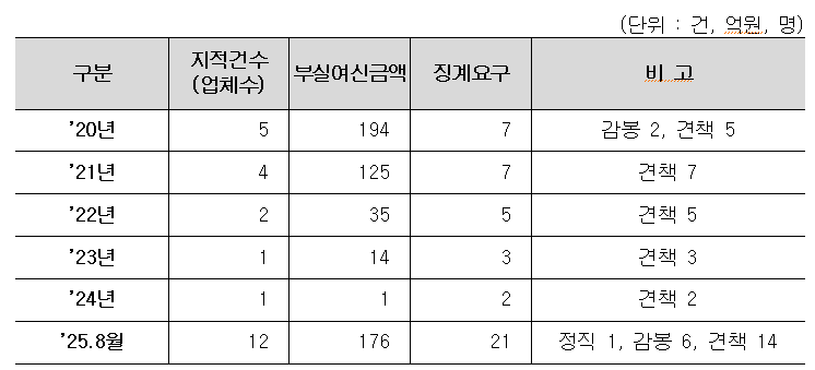 산업은행에서는 2020년부터 2025년 상반기까지 총 3조 735억 원의 부실여신이 발생했는데, 적발업체는 479개, 지적 건수는 124건에 달했다. 이에 관련해 징계를 받은 사람은 모두 5명으로, 3명이 견책되고, 2명은 감봉 처분을 받다.