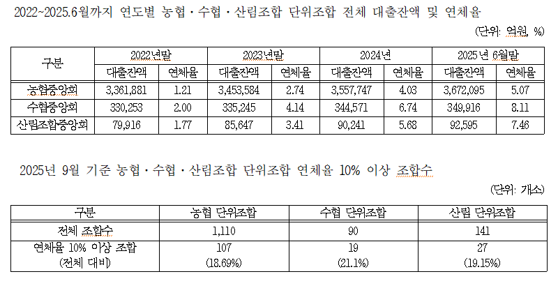 세부적으로 살펴보면, 각 조합별 최고 연체율은 24.48%~43.06%에 달했다. 농협 단위조합의 연체율 1위는 43.06%로 평균 연체율인 5.07%의 8.5배에 해당했다. 특히 해당 단위조합은 2024년 연체율이 36.39%로 가장 높았고, 올해의 경우에는 연체율이 무려 6.67%p나 늘어나 작년 국정감사에서 연체율 경감대책을 시행할 것을 주문하였음에도 효과가 없었음을 단적으로 보여줬다. 수협과 산림조합 단위조합 중 최고연체율은 각각 24.48%, 35.72%로 나타났다