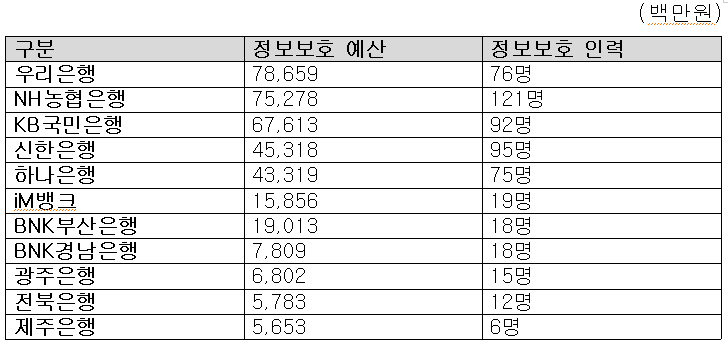 올해 상반기 기준 KB국민은행의 정보보호 인력은 92명, 신한은행 95명, 하나은행 75명, 우리은행 76명, NH농협은행 121명으로 집계됐다. 지방은행의 경우 BNK부산은행 18명, BNK경남은행 18명, 광주은행 15명, 전북은행 12명, 제주은행 6명 등 모두 20명 이하였다.