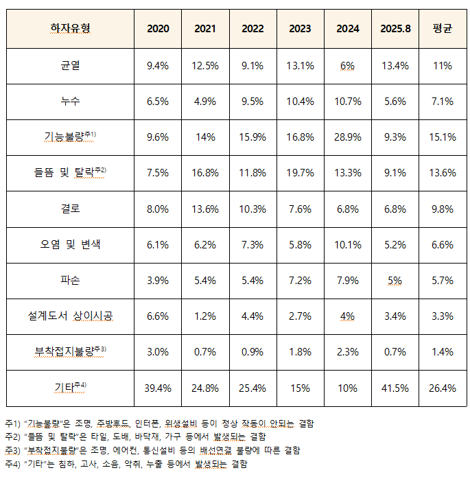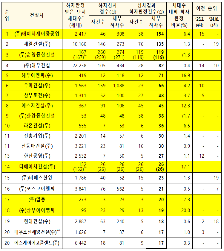 최근 6개월(’25.3.~’25.8.)을 기준으로 하자판정 건수가 많은 상위 건설사는 ㈜에이치제이중공업(154건, 세부 하자수 기준), 제일건설㈜(135건), ㈜순영종합건설(119건), ㈜대우건설(82건), 혜우이엔씨㈜(71건) 순으로 나타났다.