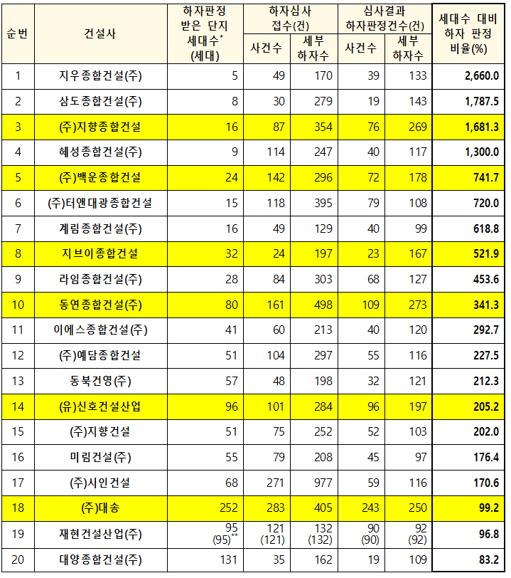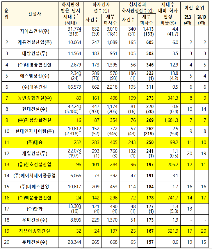 최근 5년(’20.9~’25.8) 누계 기준으로 하는 경우, 지에스건설㈜(1,413건, 세부 하자수 기준), 계룡건설산업㈜(605건), 대방건설㈜(503건), ㈜대명종합건설(346건), 에스엠상선㈜(323건) 순으로, 지난 4차 발표(’25.3.)시 상위 건설사 순위와 동일하였다.