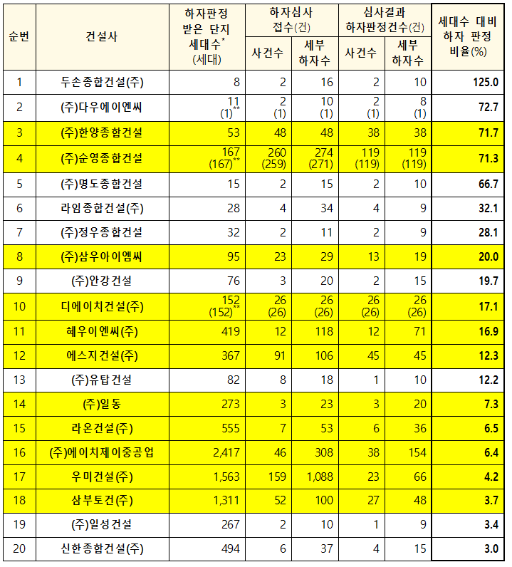 하자판정비율 상위 건설사는 하자판정 비율((세부하자판정건수 / 하자판정 받은 단지의 전체 공급 세대수∙호수의 합) × 100 )을 기준으로 하는 경우, 최근 6개월(’25.3.~’25.8.)간 상위 건설사는 두손종합건설㈜(125.0%), ㈜다우에이엔씨(72.7%), ㈜한양종합건설(71.7%), ㈜순영종합건설(71.3%) 및 ㈜명도종합건설(66.7%) 순으로 나타났다.