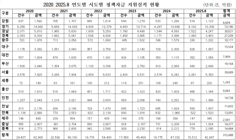 지원금액은 ▲2020년 6조2900억원 ▲2021년 6조100억원 ▲2022년 5조4400억원 ▲2023년 4조5469억원 ▲2024년 4조7332억원, ▲2025년 8월 4조2,487억원으로 2020년부터 2025년 8월까지 총 지원금액은 31조 2,688억원이었다.