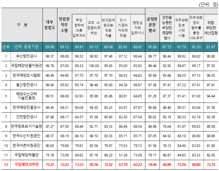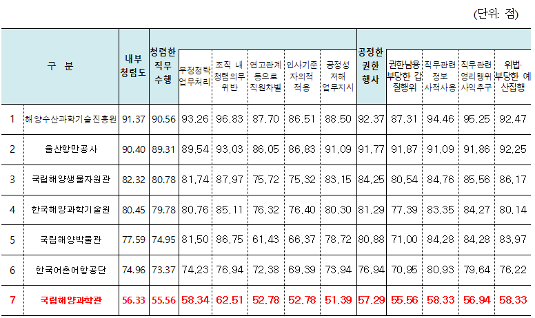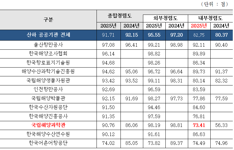 송옥주 의원실이 해양수산부와 국립울진해양과학관으로부터 제출받은 자료에 따르면, 국립울진해양과학관은 최근 실시된 내부청렴도 평가에서 해양수산부 산하 공공기관 중 4년 연속 최하위를 기록하며 심각한 청렴도 하락 문제를 드러냈다.