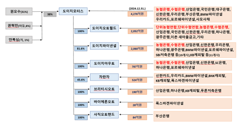 도이치 오토모빌 그룹의 모기업인 도이치모터스에는 총 4,276억원의 대출이 이루어졌다. 도이치오토월드의 대출금은 2,052억원, 도이치파이낸셜의 대출금은 2,060억원, 도이치아우토의 대출금은 787억원, 차란차의 대출금은 524억원, 브리티시오토의 대출금은 190억원, 바이에른오토의 대출금은 28억원, 사직오토랜드의 대출금은 84억원으로 나타났다.(2024년 말 기준)