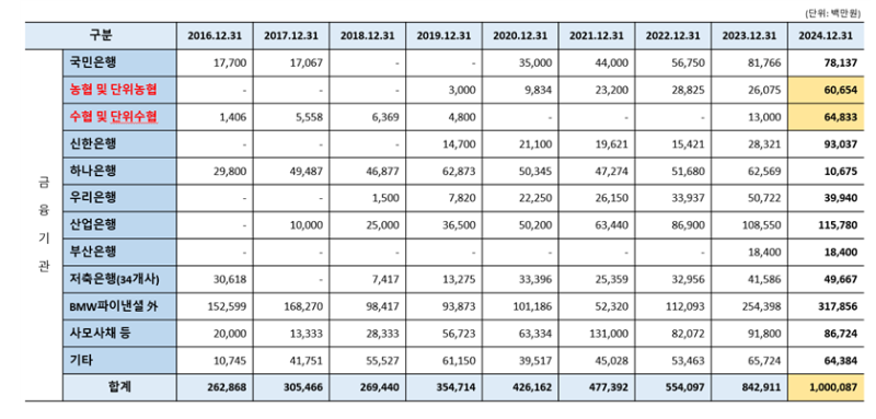 이원택 국회의원(민주당, 군산시김제시부안군을)이 금융감독원과 시중 여러 은행으로부터 제출받은 2025년 국정감사 자료를 분석한 결과, 도이치모터스 및 자회사들이 시중 은행들로부터 2024년 12월 31일자로 1조원이 넘는 대출을 받은 것으로 확인하였다.