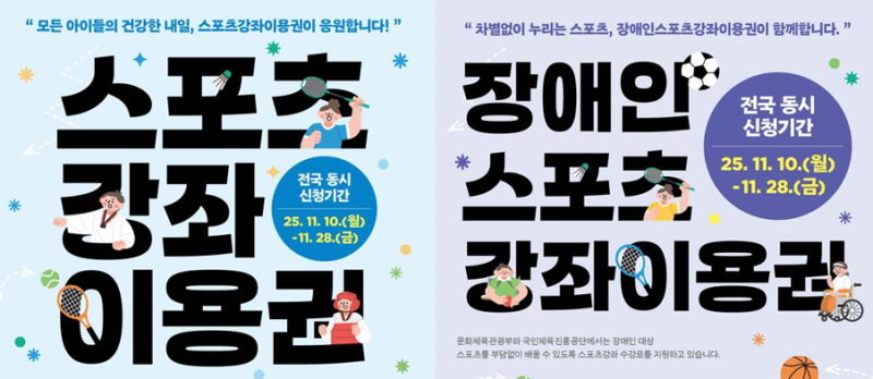 신청 대상은 5세부터 18세까지(2008~2021년 출생)의 저소득층으로, 월 최대 10만 5천 원까지 지원받을 수 있다. ‘장애인스포츠강좌이용권’은 5세부터 69세까지(1957~2021년 출생)의 장애인이 신청할 수 있으며, 월 최대 11만 원까지 지원받는다.