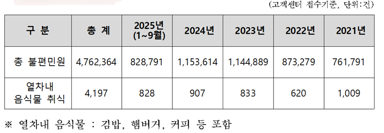 윤 의원이 공사에서 제출받은 자료에 따르면, 최근 5년간 지하철 내 음식물 취식 관련 민원은 △2021년 1,009건 △2022년 620건 △2023년 833건 △2024년 907건 △2025년 9월까지 828건 등 총 4,197건으로 집계되었으며, 연평균 약 1,000건에 육박한 것으로 나타났다.
