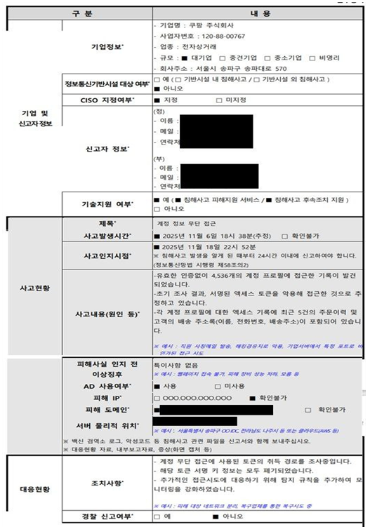 그럼에도 쿠팡은 12일이 지난 11월 18일 22시 52분에야 처음으로 비정상 접근을 인지했고, 다음날인 11월 19일 21시 35분 KISA에 침해사고 사실을 신고했다.