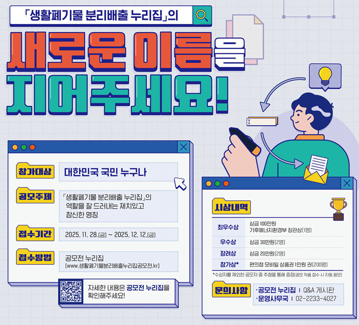 최우수작(1점)은 ‘생활폐기물 분리배출 누리집’의 새로운 이름으로 활용될 뿐만 아니라 기후에너지환경부장관상과 상금 100만 원이 주어지고, 우수작(2점)은 30만 원, 장려작(2점)은 20만 원의 상금이 지급된다. 참여자 200명에게는 추첨을 통해 1만 원대 모바일상품권(기프티콘)도 증정된다.