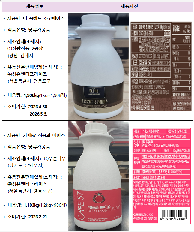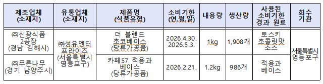 식품의약품안전처(처장 오유경)는 ‘(주)성유엔터프라이즈(서울특별시 영등포구 소재)’가 소비기한이 경과된 원료로 제조된 당류가공품을 판매한 사실을 확인하고 해당 제품을 판매중단 및 회수조치한다고 밝혔다. ㈜성유엔터프라이즈는 수입식품 2종( ‘토스키 초콜릿맛 소스(기타코코아가공품)’, ‘적용과 베이스(음료베이스)’ )을 수입해 소비기한을 사실과 다르게 연장하여 표시한 후 식품제조·가공업체에 원료로 제공하고 당류가공품 2종을 제조하게 한 것으로 확인됐다. 식약처관계자는 "서울특별시 영등포구청이 해당 제품을 신속히 회수 조치하도록 했으며, 해당 제품을 구매한 소비자에게 섭취를 중단하고 구입처에 반품해 줄 것"을 당부했다.