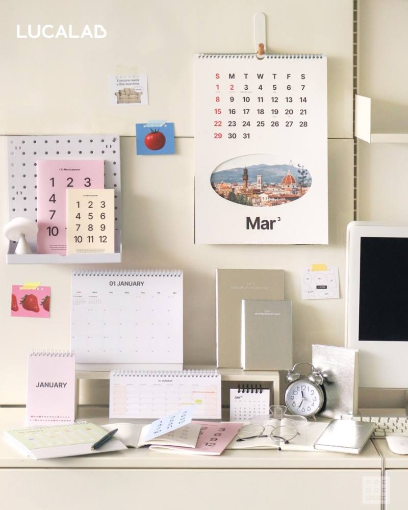 매달 바뀌는 풍경으로 공간에 특별한 감성을 더하거나, 마음에 드는 포스터를 오려 엽서로 활용할 수도 있다. 탁상형 달력 형태의 ‘루카랩 습관 체크 캘린더’는 앞뒷면을 같은 월에 각기 다른 용도로 사용할 수 있다.