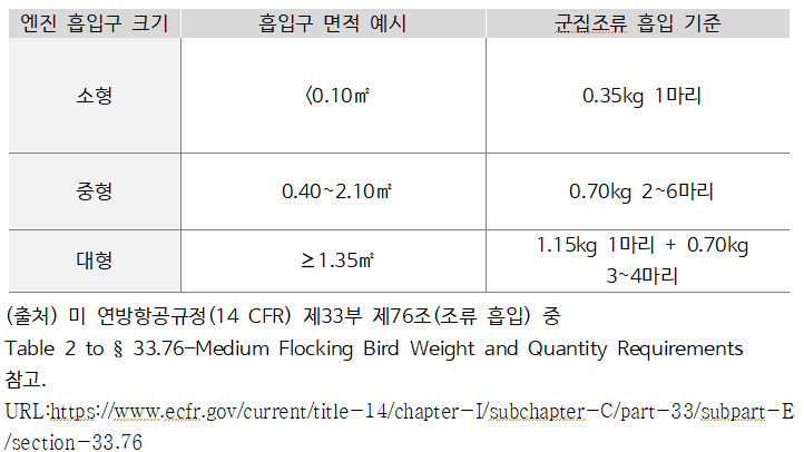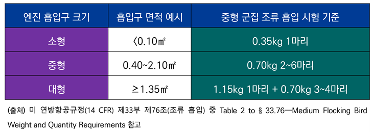 해당 규정은 가창오리와 같은 중형 군집 조류와의 충돌·흡입 상황을 전제로, 엔진 흡입구 면적에 따라 시험 시나리오를 구분하고 있다.