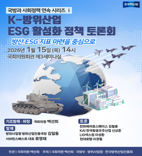 이어 백 의원은 “이번 토론회는 K-방산이 국제사회에서는 신뢰받고, 국내에서는 사회적 책임을 다하는 산업으로 나아가기 위한 첫 출발점”이라며 “앞으로 국방과 교육, 복지 등 사회정책을 연결하는 연속 토론회를 통해 군과 시민사회가 균형 있게 상생할 수 있는 정책 대안을 마련하겠다”고 밝혔다.