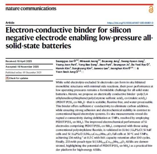 이번 연구 결과는 국제 학술지 ‘네이처 커뮤니케이션스 ’에 지난해 12월 5일(온라인 프리뷰 게재 기준. 학술지 교정(proofreading) 과정을 거쳐 2026년 1월 6일 공식 게재) ) 게재됐다. 심사위원들은 이번 연구가 기존 액체 전해질 기반 배터리에서 활용이 제한됐던 전도성 고분자 바인더를 전고체 배터리 환경에서 안정적으로 구현하며 적용 범위를 넓혔다는 점에 주목했다.