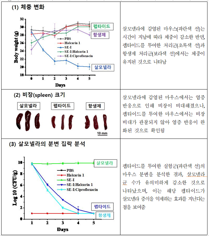 이번 연구 결과는 인공지능 기술로 찾아낸 펩타이드가 살모넬라 감염으로 인한 장 염증을 효과적으로 완화하는 것을 실험 결과로 확인했으며, 염증 유발 물질의 분비를 조절하고 장 점막을 보호하는 작용도 나타났다. 이로 인해 살모넬라 균에 의한 장질환 감소율은 기존 항생제인 키프로플록사신의 87.78%보다 높은 89.17%로 나타났다.