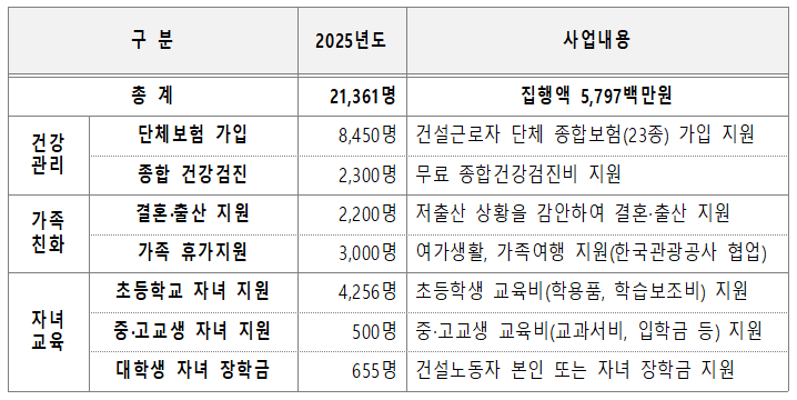 인상된 부가금 재원은 건설노동자에게 실질적인 혜택이 돌아갈 수 있도록 청년층 대상 기능 향상 훈련 확대, 노동자 상조 서비스 및 취업지원 거점센터 운영, 스마트 안전 장비 지원 등 노동자와 사업주 모두가 체감할 수 있는 복지 및 고용환경 개선 사업에 집중 활용할 예정이다.