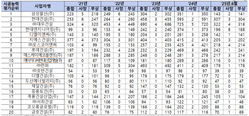 이 가운데 5년간 가장 많은 산재가 발생한 대우건설의 경우 ‘21년도(324건) 대비 ‘24년도(725건) 산재발생 건수가 2배 이상 대폭 증가한 것으로 나타났다.