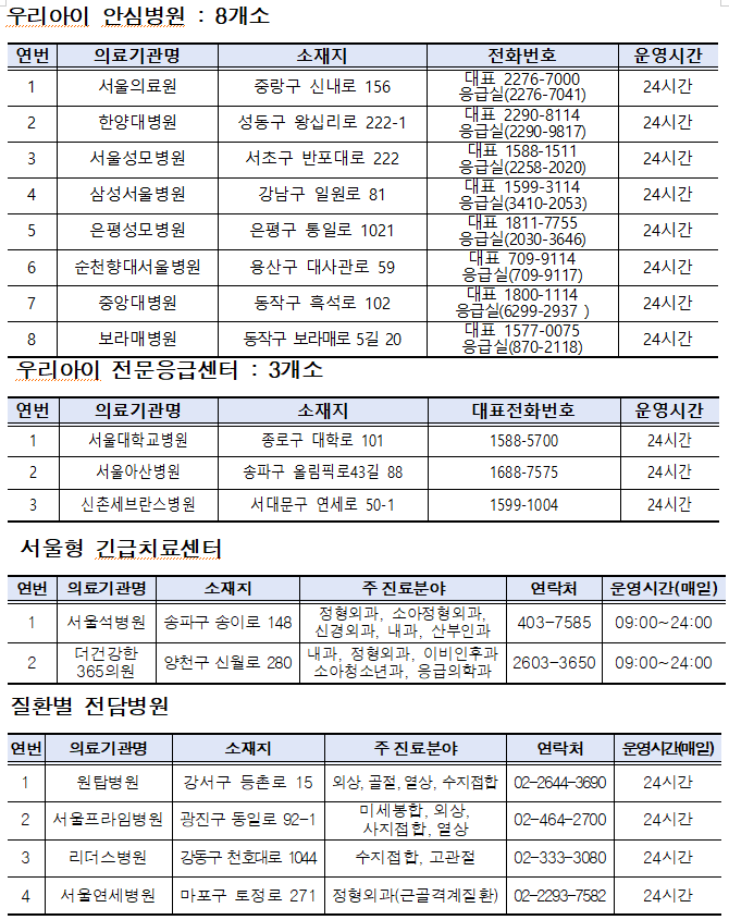 소아 환자를 위한 ‘우리아이 안심병원’(8개소)과 ‘전문응급센터’(3개소), 경증환자를 위한 긴급치료센터(2개소) 및 질환별 전담병원(4개소)도 휴일 없이 운영해 의료 공백을 최소화할 계획이다.