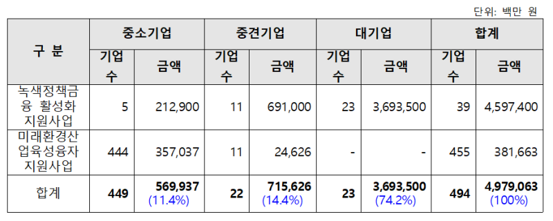자료에 따르면, 2024년 한 해 동안 환경부가 집행한 녹색융자는 총 지원금액 중 대기업이 3조6935억원(74.2%)을 차지했다. 반면 중소기업 지원은 11%에 불과한 5,699억원에 불과했다.