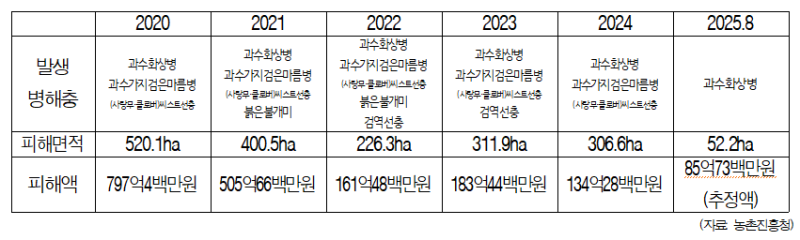 연도별 식물병해충 피해 면적과 피해액은 ▲2020년 520.1ha, 797억4백만원, ▲2021년 400.5ha, 505억66백만원 ▲2022년 226.3ha, 161억48백만원 ▲2023년 311.9ha, 183억44백만원 ▲2024년 306.6ha, 134억28백만원 ▲2025년 8월 기준 52.2ha, 85억73백만원(추정액)으로 매년 발생하는 식물병해충의 총량은 다소 줄어든 추세이다.
