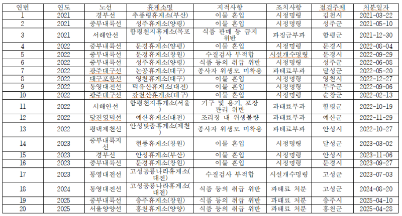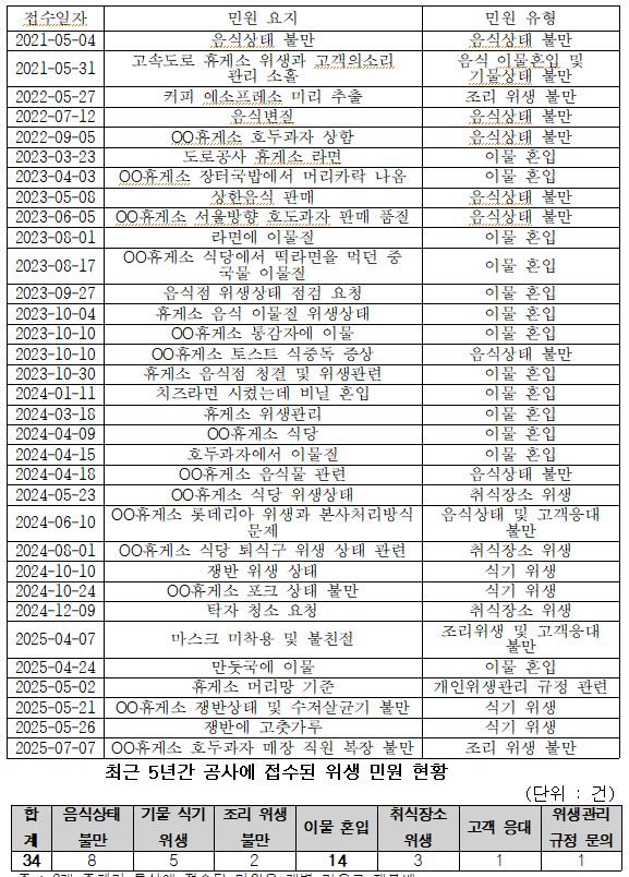 국회 국토교통위원회 소속 송기헌 의원(강원 원주을·3선)이 한국도로공사로부터 제출받은 자료에 따르면, 최근 4년간 한국도로공사에 접수된 위생 관련 민원은 2021년 2건에서 2024년 11건으로 증가한 것으로 나타났다. 이물 혼입이 14건으로 가장 많았고, 음식 상태 불만이 8건, 기물 또는 식기 위생 불만이 5건으로 뒤를 이었다. ※상세 민원 접수 현황 별첨 1 참조