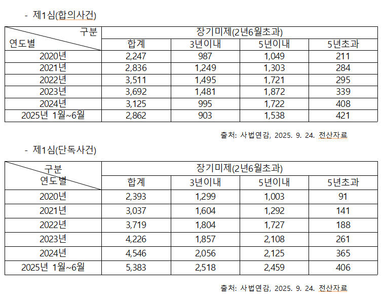 실제로 민사 1심 합의사건의 경우 5년 초과 장기미제는 2020년 211건이던 것이 2025년 6월 말 현재 421건으로 2배나 늘었다. 단독사건의 경우는 더욱 심하다. 2020년 91건에 불과했던 것이 2025년 6월 말 현재 406건으로 4.4배가 폭증했다.