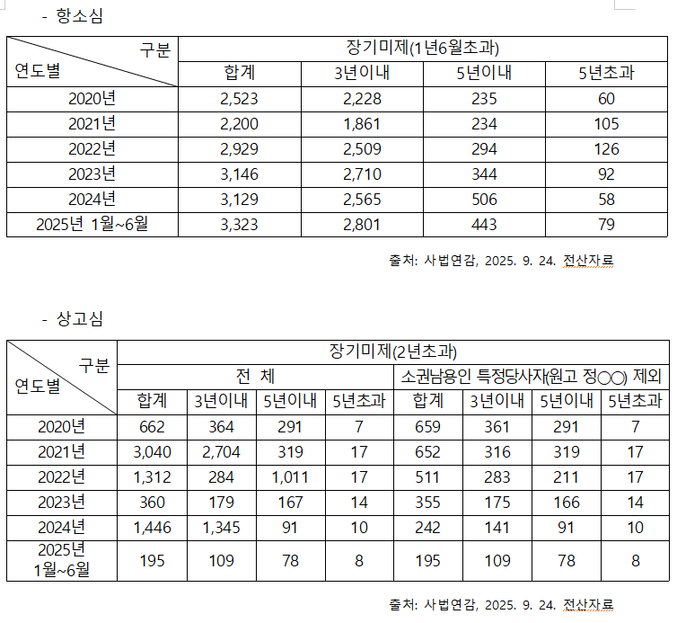 3일 국회 법제사법위원회 국민의힘 송석준 의원(경기 이천시)에게 대법원이 제출한 장기미제 현황 자료에 따르면, 최근 6년간(2020~2025년 6월 말) 민사와 형사 가릴 것 없이 1심(지방법원)과 2심(지방법원 합의부와 고등법원)에서 5년 초과하는 장기미제 사건이 최대 6배가량 증가한 것으로 나타났