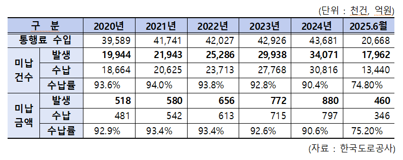 최근 5년(2020~2024년)간 통행료 미납건수는 총 1억 3,118만 2천 건이며, ‘25년 상반기에만 1,796만 2천 건으로 2020년 한 해 미납건수(1,994만 4천 건)에 육박하는 것으로 드러났다.