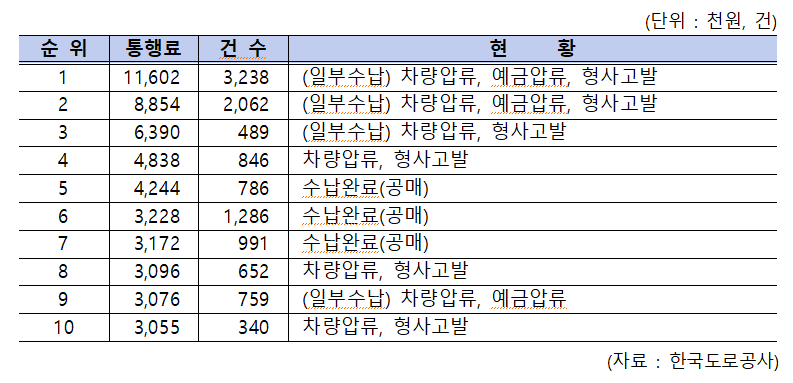 한국도로공사 관계자는 "상습 미납자에 대해 차량 및 예금 압류와 형사고발 등을 통해 수납을 강제하고 있다"고 밝혔다.