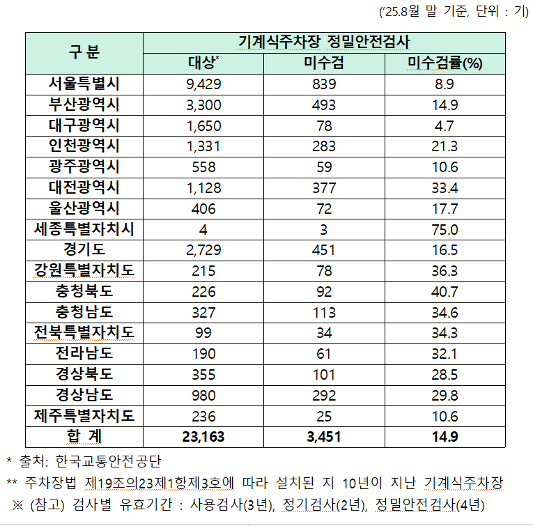 노후 기계식주차장 중 15%는 법정 정밀안전검사 안 받아...10기중 1기는 여전히 정밀안전검사 받지 않고 운영 중