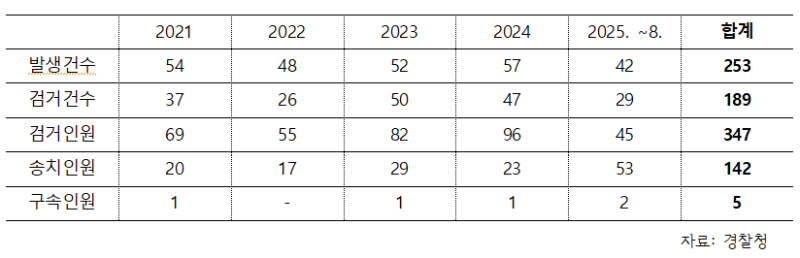 같은기간 검찰에 송치된 인원은 142명이다. 2021년 20명, 2022년 17명, 2023명 29명, 2024년 23명, 올해 8월까지 송치된 인원은 53명으로 올해는 이미 지난해 23명의 두배를 훌쩍 넘는 수준이다. 구속까지 이뤄진 인원은 5년간 5명에 그쳤다. 이중 올해 2명이 구속됐다.