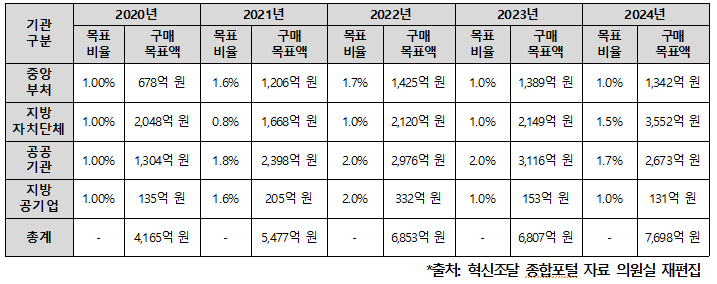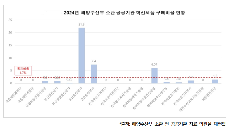 그러나 해양수산부 소관 17개 공공기관의 최근 5년간 혁신제품 구매 총액은 144억 원으로 기관별 평균 구매액은 8억 원에 불과했다. 해양수산부 소관 공공기관의 물품 총 구매액 4조 5,188억 원 가운데 혁신제품이 차지한 비율은 사실상 0.3% 수준으로, 목표구매비율인 1.7%에 한참 못미친다.