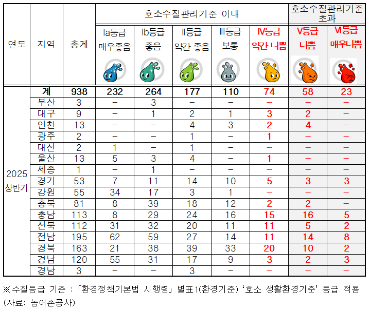국회 농림축산식품해양수산위원회 김선교 의원(경기 여주시‧양평군)이 한국농어촌공사로부터 제출받은 <지자체별 공사관리 저수지 수질점검 결과>에 의하면, 농업용수 수질측정망조사 대상시설 938개소(저수지 922개소, 담수호 16개소) 중2025년 상반기 기준 ‘약간 나쁨(4등급)’ 이상인 곳은 155개소로, 전체 16.5%에 해당하는 저수지가 수질이 좋지 않은 상태로 확인됐다.