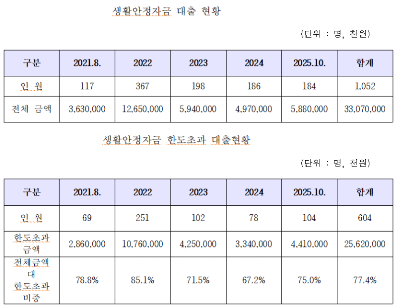 같은 기간 전체 대출액은 생활안정자금 약 331억원, 주택자금 약 218억원이었다. 이 중 한도초과 비율은 생활안정자금 77.4%, 주택자금 46.2%에 달했다.