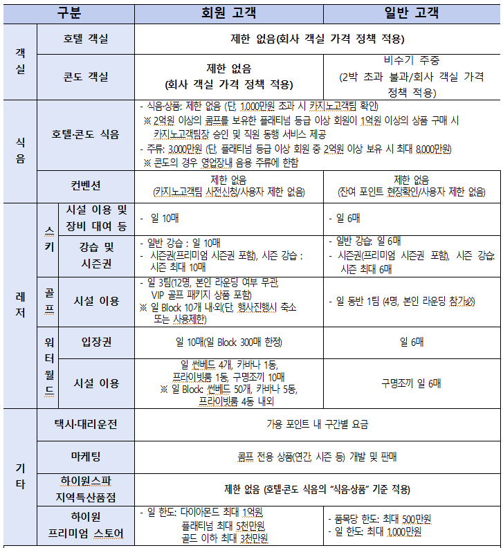 특히 강원랜드 내 호텔·콘도 식음 시설 등 직영 영업장은 일반 식음과 상품에 한도 제한이 없고, 주류 품목에서만 3,000만 원의 제한이 있다.
