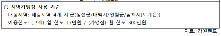 세부적으로 살펴보면 폐광지역 가맹점의 경우 고객 1인당 일일 한도가 17만 원, 가맹점 월 한도가 300만 원으로 제한되어 있다. 그러나 강원랜드 내 하이원 프리미엄 스토어에서 일반 고객은 일일 1,000만 원, 강원랜드 회원은 최대 1억 원까지 결제 가능하다.