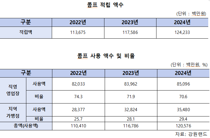 동 기간 콤프 적립액은 총 3,477억 원 중 72%에 달하는 2,510억 원이 폐광지역이 아닌 강원랜드 내에서 사용됐다.