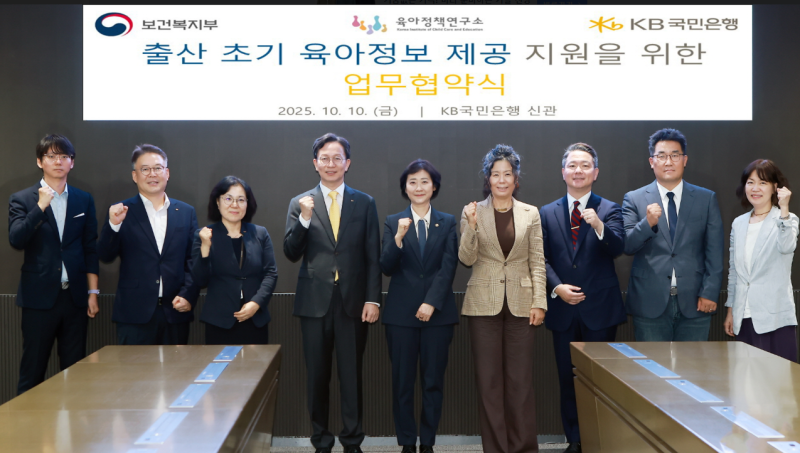 KB국민은행(은행장 이환주)은 10일 보건복지부, 육아정책연구소와 함께 출산 초기 가정의 실질적 양육교육 지원을 강화하기 위한 업무협약(MOU)을 체결했다.