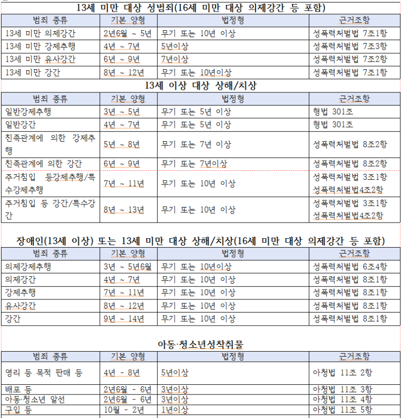 성폭력범죄가 대표적이다. 일반 강간죄의 법정형은 3년 이상 유기징역이지만, 양형위원회 기본양형은 2년 6월~5년으로 규정돼 있다. 친족관계에 의한 강간 역시 법정형은 7년 이상인데, 기본양형은 5~8년으로 낮게 설정돼 있다.